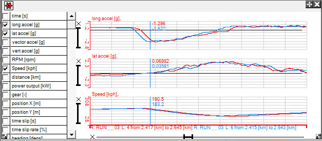 The data collected by the DL1 PRO can referenced to not just time, but also position on the track. This allows the data to be interpreted in a meaningful and understandable way, referenced clearly to the real world: Pick a corner and see how you braked, how much grip you used and where, then how you exited. Compare what you did on your fastest time through the sector and learn where you can go faster.