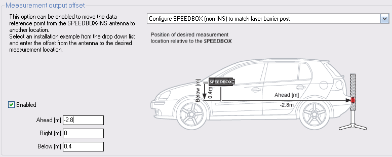 For firmware newer than v3.7.3 a measurement offset can be set up, allowing the SPEEDBOX unit to model the dynamics of the vehicle, referencing the measurement to a specific point on the vehicle, a separate component such as a laser barrier used for triggering a test, or a reference system for direct comparison. Configuring this function correctly results in increased accuracy.